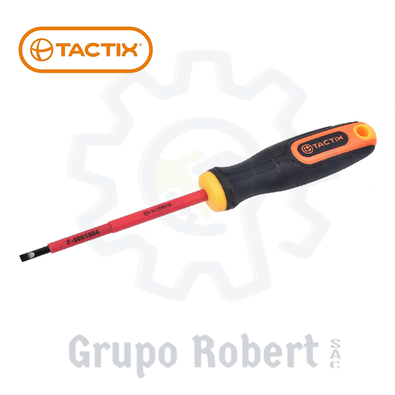 El Destornillador Aislado Plano de la marca Tactix es una herramienta manual de alta calidad diseñada para trabajos eléctricos y de mantenimiento.